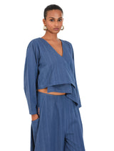 The Indigo Whisper Top is a study in thoughtful simplicity — a gently A-line silhouette that opens into a soft overlapping front, closing with a singular tich button detail. The form is open and fluid, yet precisely tailored to fall with elegance and ease.