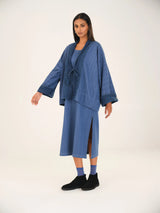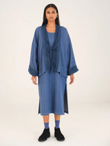 The Kimono Tie Jacket embodies understated sophistication — a silhouette that feels effortless, yet carries the precision of thoughtful craftsmanship. Cut in a straight form, the jacket drapes fluidly over the body, offering both comfort and quiet structure.