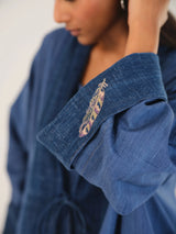 At the front, a handcrafted drawstring cinches the silhouette with ease, its ends adorned with denim-crafted feather charms, evoking lightness and poetic freedom. A subtle feather embroidery rests discreetly on the inner sleeve — revealed only when folded — a hidden gesture of artistry that rewards the observer’s gaze.