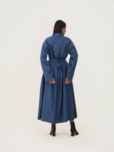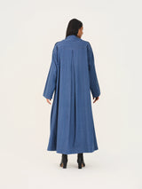 Paired with it, the trench long jacket adds architectural presence. The statement shoulders, full sleeves, and slightly above-ankle length create an elongated, graceful line. The jacket features a hidden front placket detailed with coconut shell buttons, underscoring the label’s devotion to natural, conscious materials. An optional Denim crafted allows the look to shift seamlessly—belted, it becomes polished and dress-like; unbelted, it exudes quiet ease and refined confidence.